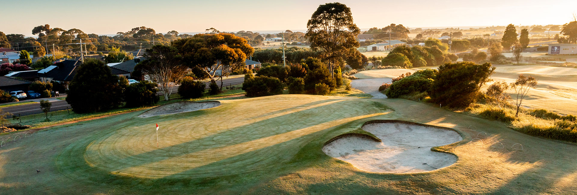 Another genuinely challenging hole, even with the help of the prevailing breeze. A sweeping dog-leg to the right features the course’s largest water hazard down the left and fairway bunkers to the right.